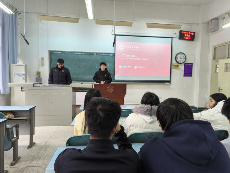 本网讯为提升团员青年数字素养、推动AI技术实用化,全讯600cc大白菜“数智AI”宣讲队于2025年11月23日下午,赴金数2541团支部举行以“coze智能体:零代码打造你的第一个AI助手”为主题的宣讲会,由徐晖、王能担任主讲人。
