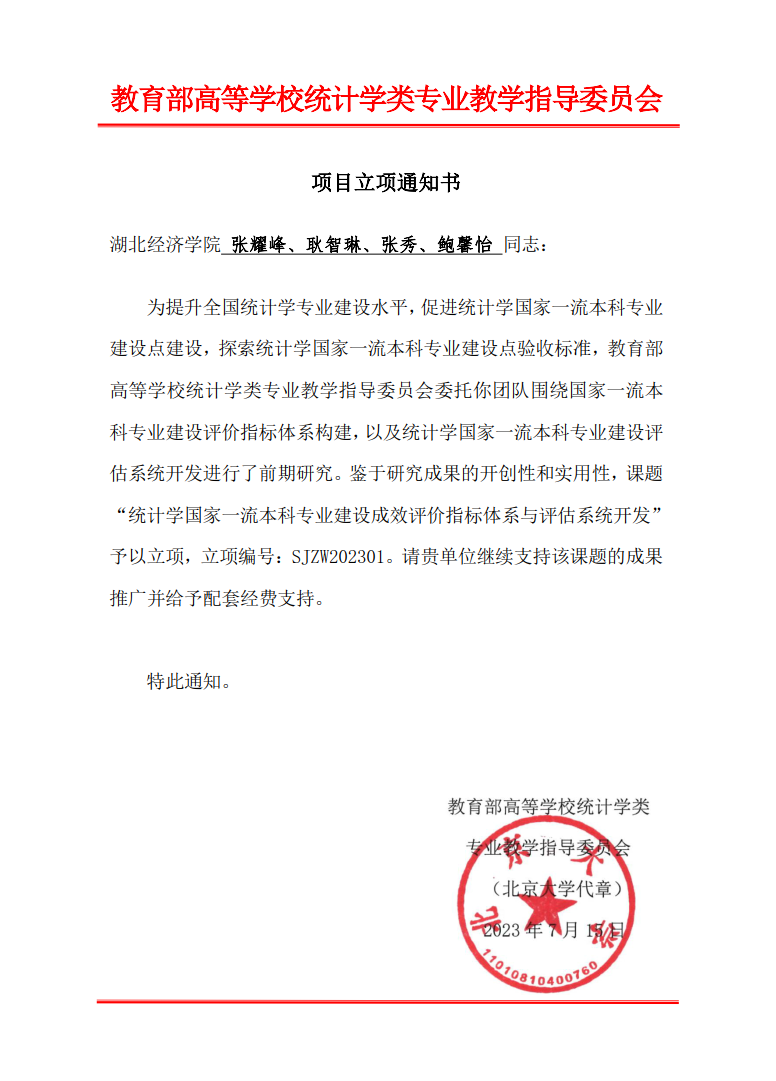 (通讯员:鲍馨怡;审稿人:张耀峰)近日,教育部高等学校统计学类专业教学指导委员会发来通知,我们张耀峰、耿智琳、张秀、鲍馨怡老师开发的“统计学国家一流本科专业建设成效评价指标体系与评估系统开发”获得专项课题立项。这是该团队在为我校开发国家一流专业建设评价指标体系的基础上,受教育部高等学校统计学类专业教学指导委员会委托,围绕国家一流本科专业建设评价指标体系构建,以及统计学国家一流本科专业建设评估系统开发进行的专项研究,旨在为提升全国统计学专业建设水平,促进统计学国家一流本科专业建设点建设,探索统计学国家一流本科专业建设点验收标准。课题组针对统计学专业特点,构建统计学国家一流专业建设标准,探索专业评估数字化转型路径,是我们教学研究的又一项重要成果。